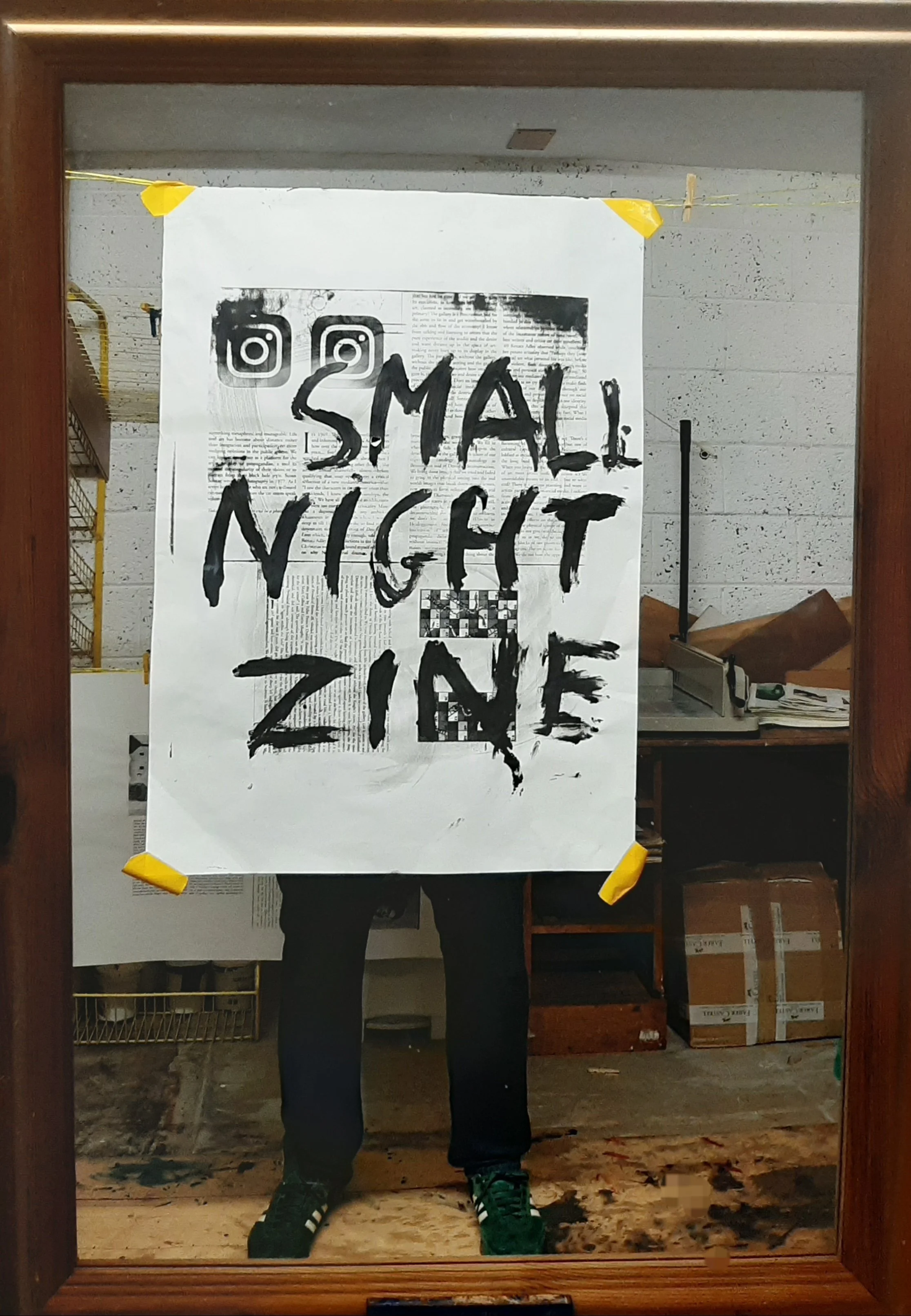 Small Night IRL is a studio, in a garage, in the south east of Ireland (incidentally also IRL). For the last seven years Small Night has screen-printed artists’ ideas and images for dissemination through zine and exhibition. We continue to explore how artist self-organisation through screen-printed publications might function in an increasingly volatile cultural landscape, particularly as rising costs and rents make independent cultural activity more fragile, and commodified online platforms dematerialise art and meaningful discourse. Small Night Zine is one small attempt to build supportive micro-constellations within that reality.