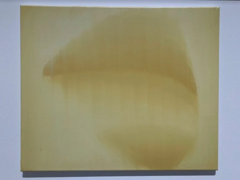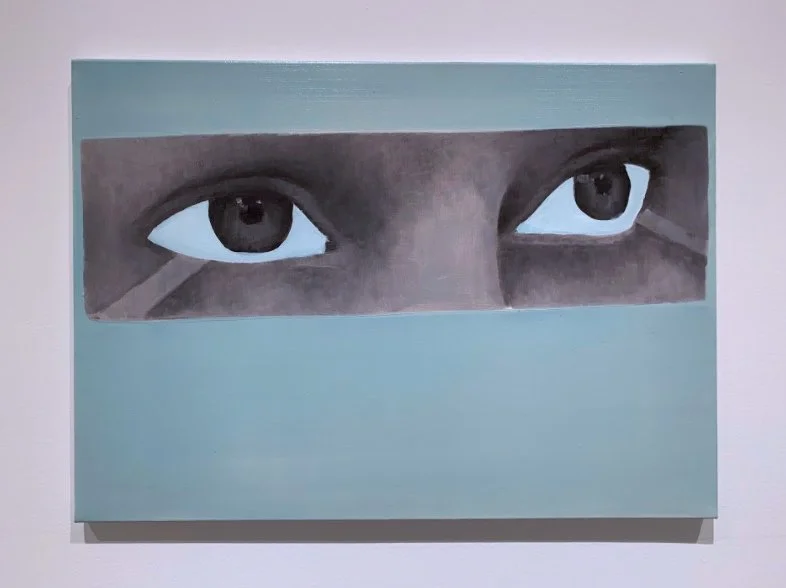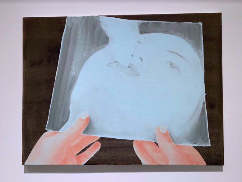 I wrote in a recent review of Ciara Roche’s paintings at Mother’s Tankstation Dublin (link here), that there is “a turn in her paintings” that helps to offset the flatness, and in turn, physically turn you into her paintings. Murphy’s paintings have more of a tilt (like Ed Ruscha’s text paintings) due to their emphasis on flatness, stemming from the source collages, like his painting of the tilted letterbox-framed eyes, or the hands that hold a painting of a head evacuating vapour, smoke or some interior essence from its mouth. Murphy’s paintings tilt against a world of soft and sharp. Some elements are sfumato soft, others are paper-cut sharp. You can’t deny references to Belgian painters Luc Tuymans and Michaël Borremans. That said, Murphy’s paintings are not concerned with the traumatic stain of history or a surrealist theatre of the absurd, but something more timely, present, one insisting on a separation between painted representation and its reality referent.