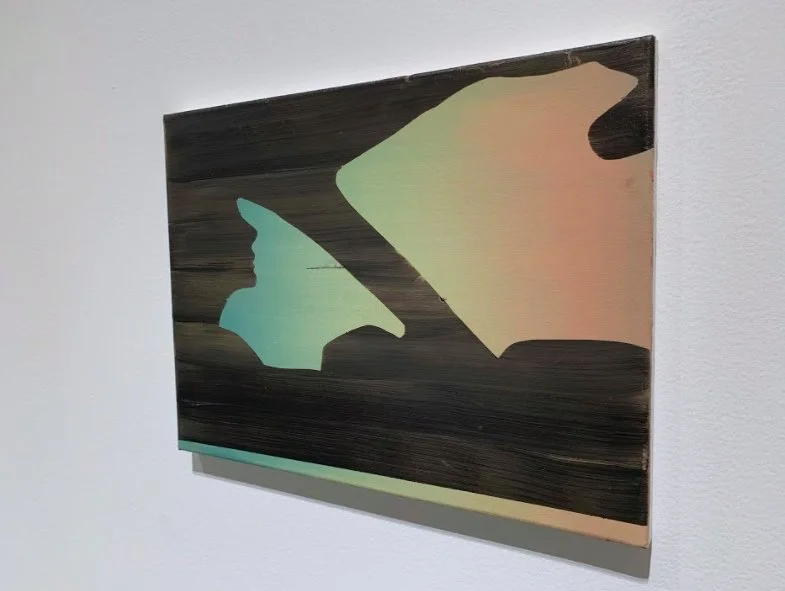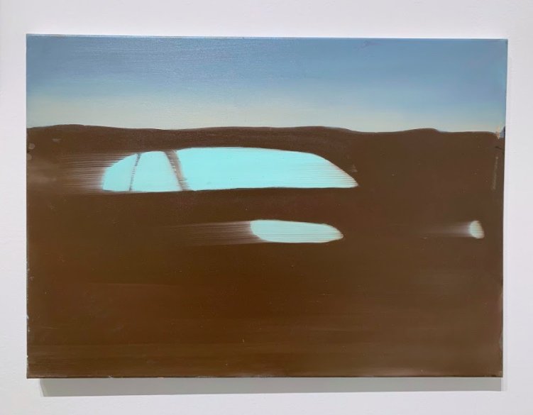 Dotted among this selection of paintings—curated by Patrick T Murphy—are three images of driving, one collage and two paintings. One of these ‘driving paintings’ is entitled Are we there yet, a minimalist blur of twilight-blue car windows and headlights evoking the sound of synthesisers circa 1986. Are we there yet is the popularised and playfully repetitive childhood mantra of unmaintainable boredom and unreachable desire mediated through The Simpsons and Schopenhauer’s existential pendulum that swings painfully from boredom to desire in his philosophy of the human condition. Are we there yet, designated as a painting title, is also a confession, one that opens up the work and exhibition towards passengers outside the field of painting, the walls of the gallery and beyond Murphy’s sometimes violent crop.
