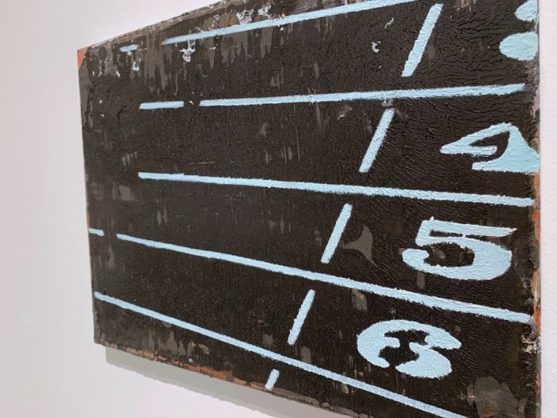 From afar Murphy’s paintings have a visual and atmospheric consistency as if they breathe the same air, but not ours. And yet the artist shifts gears from one painting to the next in how abstract shapes inform or veil the reality he is presenting in all its moodiness. Up close his painterly approach is responsive to his varied subject matter, a subject matter that most of the time lounges, what one might call an ‘aesthetic of lounging’ is at play, from the scalded orange feet lounging on a sun bed, or the serial bodies levitating in miasmic or gradient atmospheres of paint. Bleached white hands, fetishistic in their fragmentation and disarticulation from the whole body, seem all bone and no blood, as they sink into the weave of the canvas and tooth of the primer. The backdrops in contrast are swathed in horizontal or vertical strokes of opaque, dark and heavy paint embossed with a history of other decisions, buried but still haunting the surface. Strangest of all the painted textures is found smeared on Murphy’s painting of a numbered racing track, as if the painting fell onto a palette of dark paint and was then decoupled to leave an orange peel skin texture.