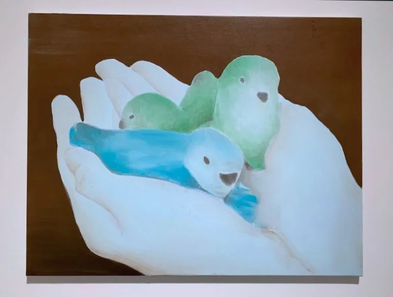 Even though there are no representations of children here, the presence of children is engendered in paintings like the hand-cupped budgies, the prostrate zebra, or the Fauvist dolphin. There is also this feeling of being watched, down low, from a child’s perspective (are those a child’s eyes lazer-glaring through that cropped letterbox-size opening of space?)