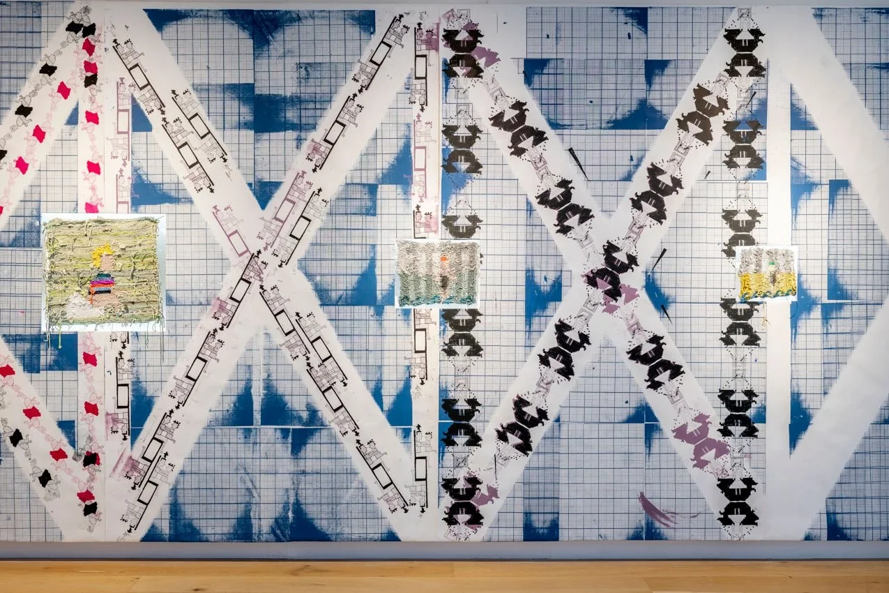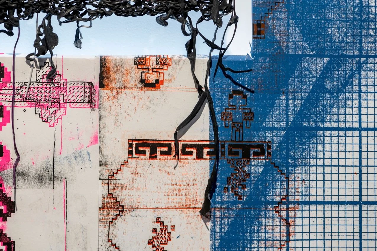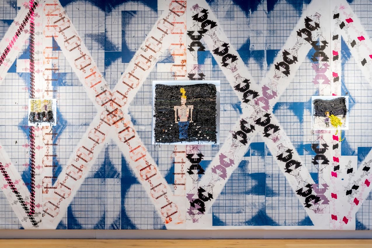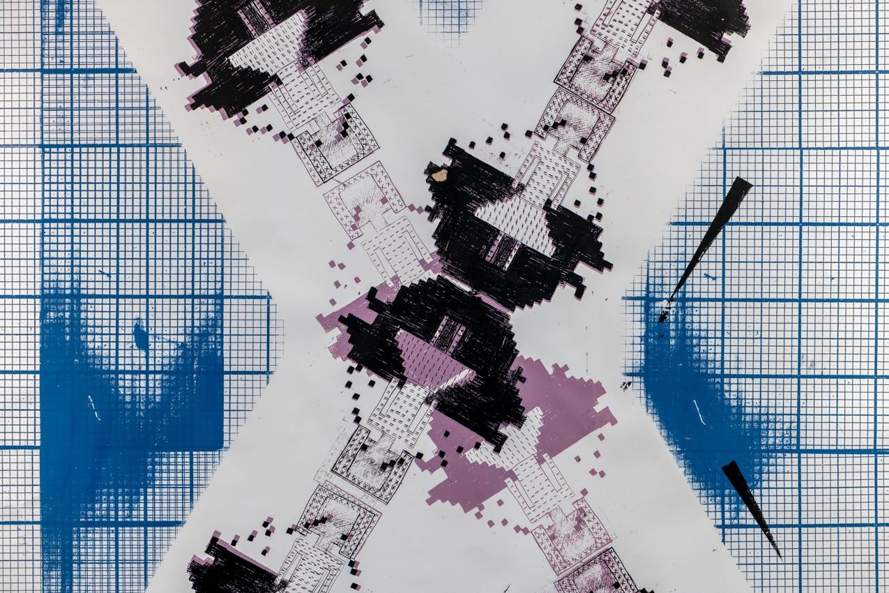 Composed of silk-screened editions of the artist’s drawings, that X the space in a paper barrage of ink + colour + splodge, Emma Roche’s paintings would exist quite nicely, quite efficiently, quite separately + sparingly like all painting against white walls. But here the paintings slot, nestled in backlit recesses against + within the wallpapered wall.
