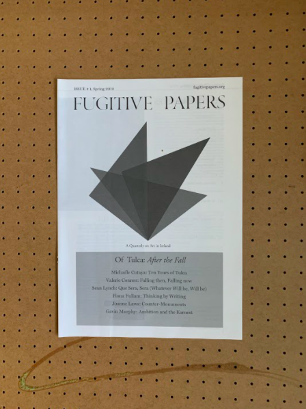 Fugitive Papers was an artistic research project by James Merrigan and Michaële Cutaya to explore ideas about art, writing, criticality and public(s) in Ireland at the time. The project aimed at opening critical spaces to think, exchange and debate about art and art-writing through public discussions, printed publications and online. Fugitive Papers worked with artists, writers and publics to consider such questions as: Is there a public role for writings on art? What forms of publishing, presentation, distribution might produce new publics? Can we imagine the emergence of new critical publics in Ireland at this time? Five 20-page publications with commissioned critical writing and artworks, and eight public dialogues, made up the project between 2011-13. It was a good time of critical exchange, in person and in print, before it was substituted for the online populism of today.